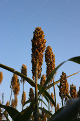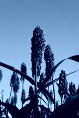 Sorghum or millet plants in the field against blue sky at sunset. Sorghum agricultural cultivation in northern Italy