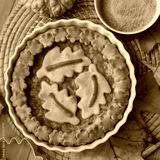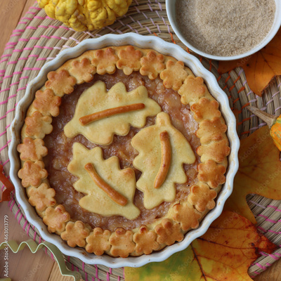 Traditional homemade Apple Pie with fall decoration on a wooden table with ornamental pumpkins and fallen leaves