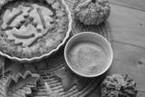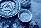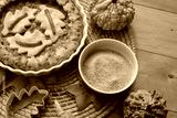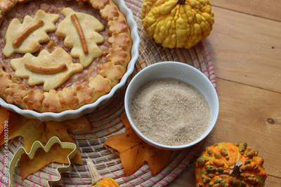 Traditional homemade Apple Pie with fall decoration on a wooden table with ornamental pumpkins and fallen leaves