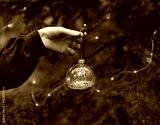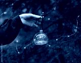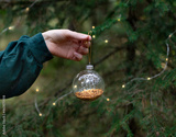 Christmas tree decoration ball in women's hand in forest. Winter holidays celebration concept greeting card