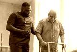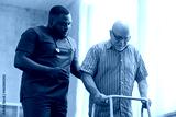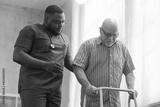 Caregiver is teaching old man to walk with walker. Professional nurse and patient in a nursing home. Assistance, rehabilitation and health.
