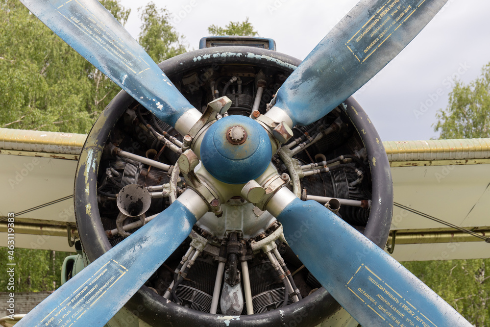 engine cylinders and propeller of an old propeller plane