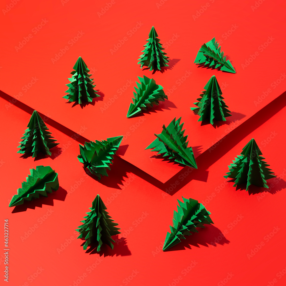 Paper Christmas trees on red background. Geometric New Year concept with sharp shadows. Minimal creative concept.