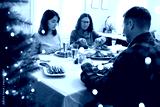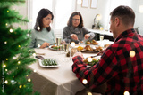 Caucasian family celebrate Christmas together at home. Eating Christmas dinner.