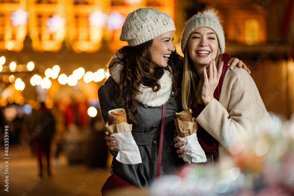 Happy women friends enjoying time together in the city with christmas decorations outdoor
