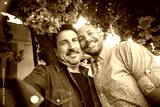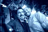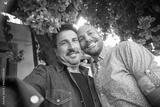 Smiling gay couple making selfie on romantic trip. Two men in casual clothes walking in park, sitting on bench, looking at camera. Love, affection, relationship, travelling concept