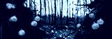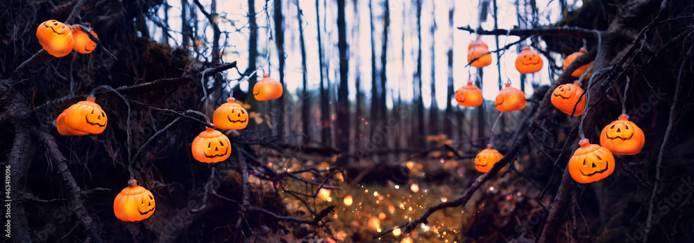Halloween Background. Beautiful dark forest backdrop with pumpkin jack-o' lanterns garlands. Halloween magic holiday art design. banner