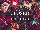 Signboard with the inscription We will be closed for the holidays. View from above, closeup, indoors, no people. Studio photo. Congratulations for family, relatives, friends and colleagues