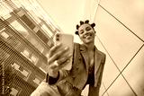 Happy young woman with hairstyle dressed in fashionable clothes makes video call or selfie via smartphone uses mobile app strolls at urban setting films vlog for social networks. Communication