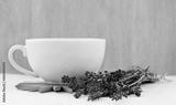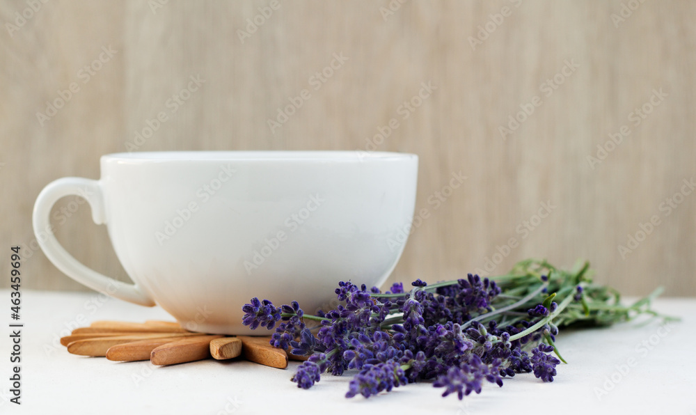 Cup of healthy hot lavender tea and lavender bouquet on a wooden table. Concept of a healthy lifestyle.