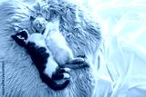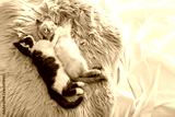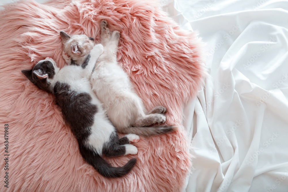 Couple little happy kittens in love sleep together hug on pink fluffy plaid. 2 two cats comfortably sleep relax at cozy home Top view. Kitten pet animal flat lay banner with copy space.