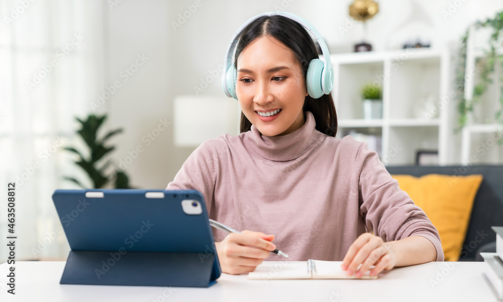 Cheerful beautiful Asian woman wearing headphones and look to digital tablet at video calling meeting and study online on the Internet.