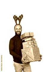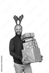 Young caucasian man with reindeer antlers looking at camera carries Christmas presents. White background. Vertical.