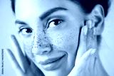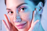 Beautiful gorgeous young woman with scrub on face studio portrait. Pretty attractive charming girl doing peeling skin touch cheeks. Spa treatment, cosmetology, beauty therapy, facial skincare