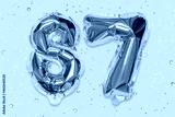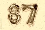 The number of the balloon made of golden foil, the number eighty-seven on a yellow background with sequins. Birthday greeting card with inscription 87. Numerical digit, Celebration event, template.
