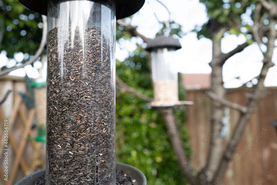 Close-up of a recently filled up bird feeder seen in an outdoor location. Used to help feed wild birds.