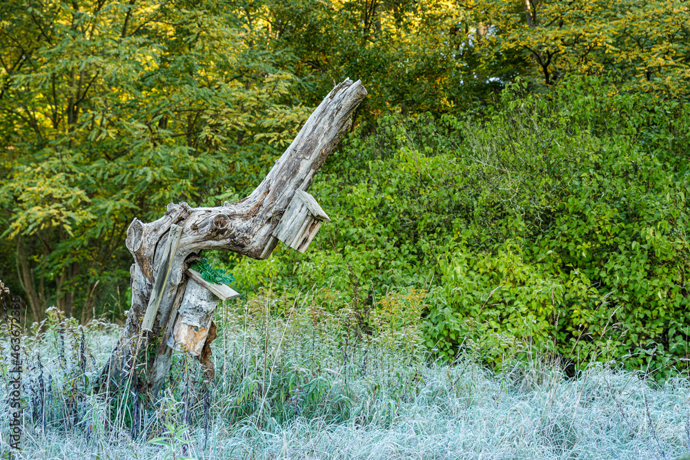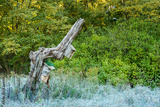 szron na trawie na skraju lasu z granicą zielonej roślinności