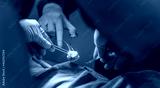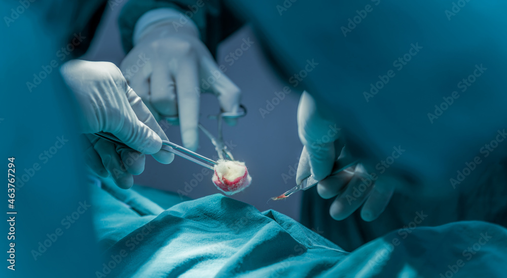 Surgical medical instruments and tools including scalpels, forceps and tweezers prepared on the table for treatment patient in operation hospital room.