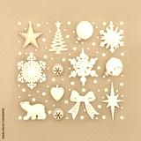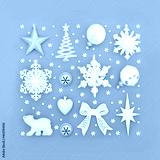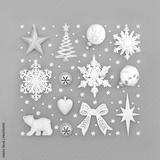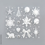 Abstract Christmas silver and frosted white bauble tree decorations on grey background. Festive composition for the Xmas season. Top view.