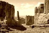 Red sandstone towers and cliff features in Arches National Park, Utah. Landmark known as Park Avenue.