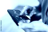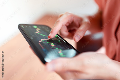 Closeup - Woman is checking Bitcoin price chart on digital exchange on mobile smartphone, cryptocurrency future price action prediction.