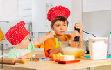 Two happy boys mix dough in bowl preparing cookie