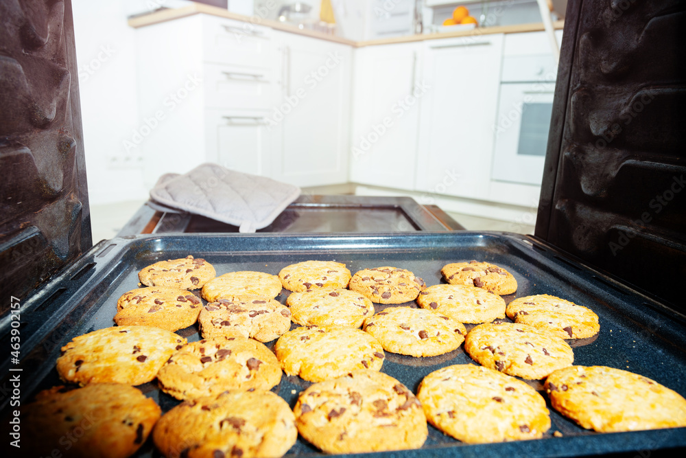 Oven open door and freshly baked cookies on tray
