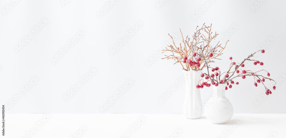 Christmas, New Year home decor. Branches with red berries in a vase, golden branches on a light background. Mock up for displaying works