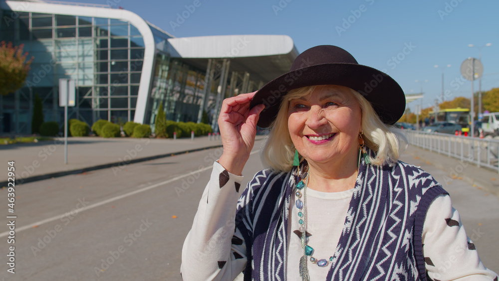 Portrait of senior pensioner tourist grandmother businesswoman stay near international airport hall or railway station carrying luggage suitcase waiting for plane or train. Travel, vacation, holidays