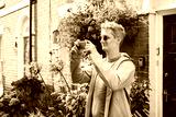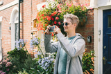 Young male tourist filming video or taking photo pictures on mobile phone during walking in the cottagecore residential area. Beautiful street view with many potted plants and flowers.