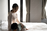 ワンオペの育児疲れで疲れてしまった絶望感が伝わる若い日本人のママ1 コピースペースあり