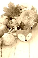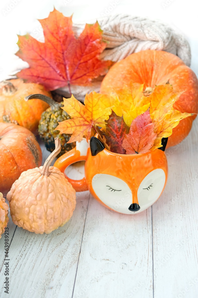 cute fox cup, autumn leaves and pumpkins on wooden table. seasonal autumn composition, cozy home. symbol of fall time.