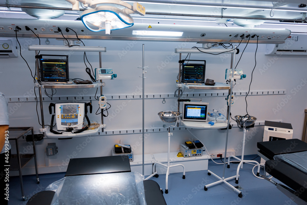 Mobile hospital with sliding module. Interior of a new military mobile hospital
