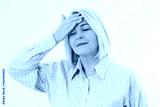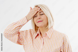 Women Hormonal Headaches. Middle aged woman with Menopause migraines isolated on white background. Copy space. Strong and hard female pain. Depression and stress health problem.