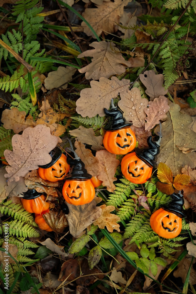 pumpkins jack-o' lantern garlands on autumn leaves and grass, forest natural background. symbol of Halloween holiday, Samhain sabbat. festive fall season