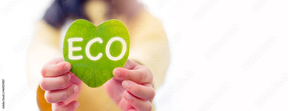 ECO word on green leaf with heart shape.Eco go green, Sustainable fashion business, save nature energy, banner background.child children kid recycle friendly environment.zero waste, reuse, reduce.