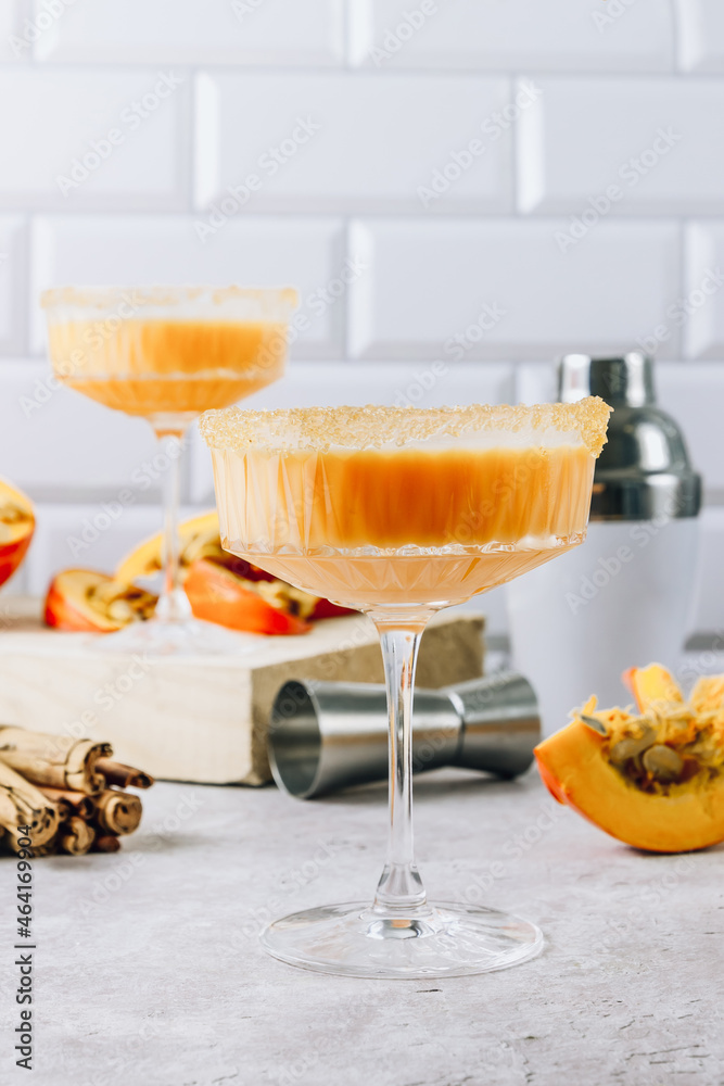 Autumn, Thanksgiving cocktails. Pumpkin margarita or Martini with cinnamon on stone table.