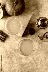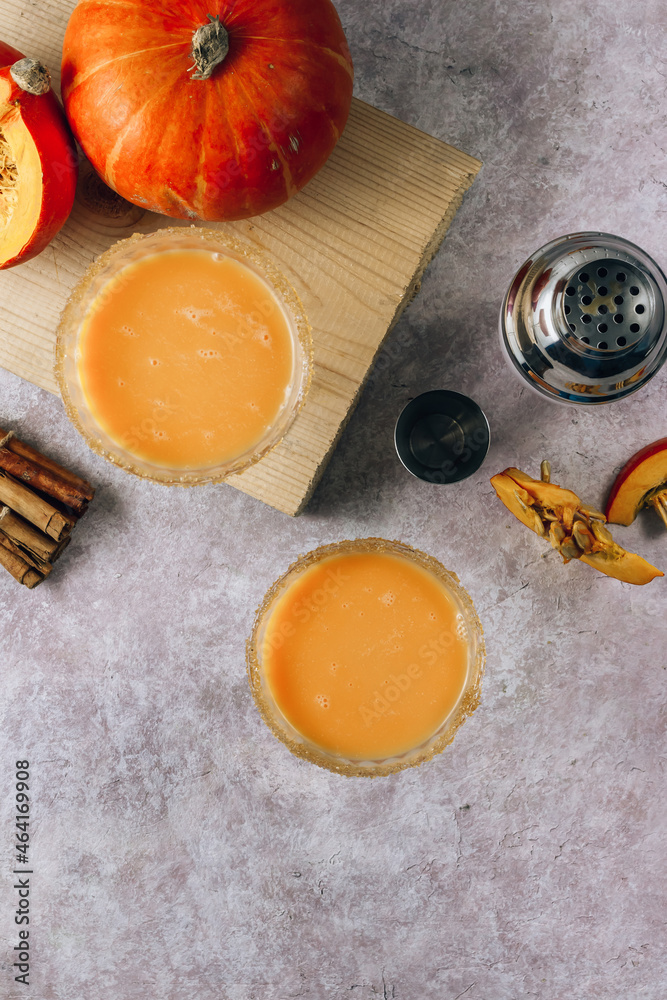 Autumn, Thanksgiving cocktails. Pumpkin margarita or Martini with cinnamon on stone table.