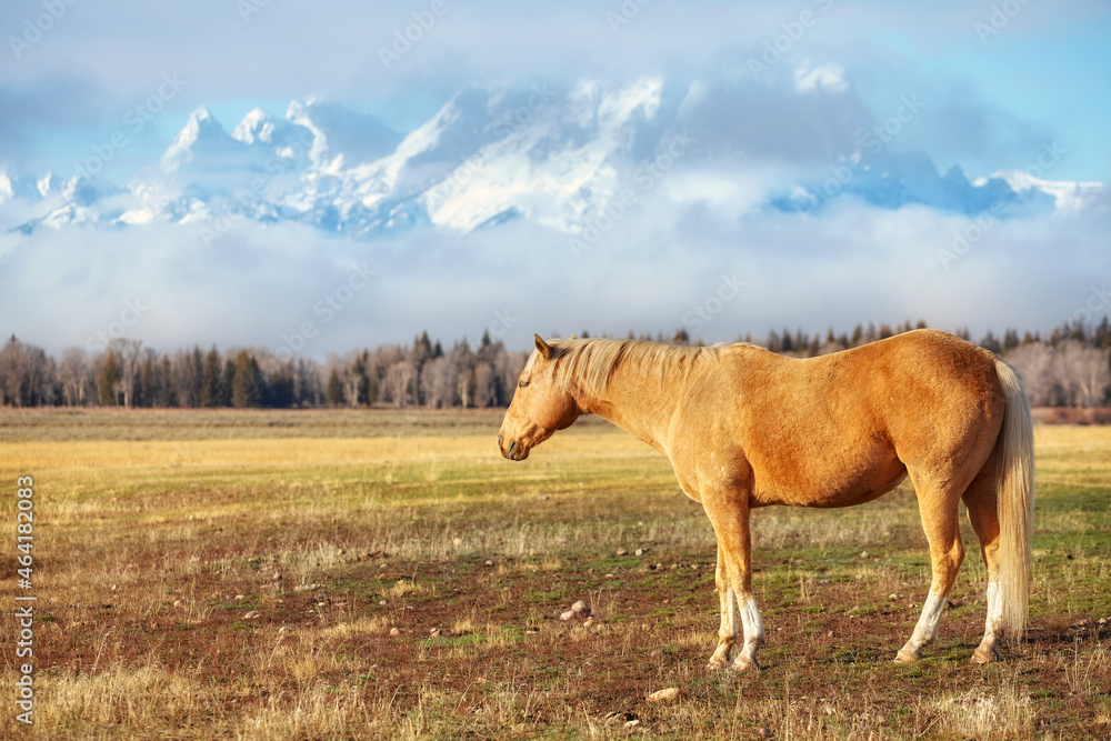 Horse on pasture with Teton Range in background, Wyoming, USA.