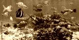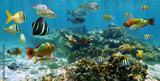 Underwater panorama coral reef with shoal of colorful tropical fish, Caribbean sea