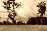 Landscape green rice field and cloudy sky. Rice farm with tropical tree. Agriculture land plot for sale. Farm land. Rice plantation. Organic rice farm. Country view. Carbon credit concept. Rural area.