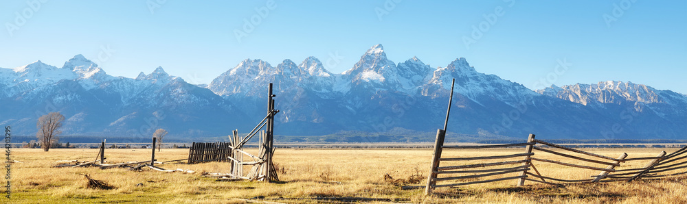 Old broken wooden fence on a field with Teton mountain range in background, Wyoming, USA.