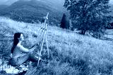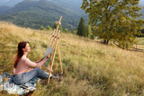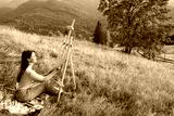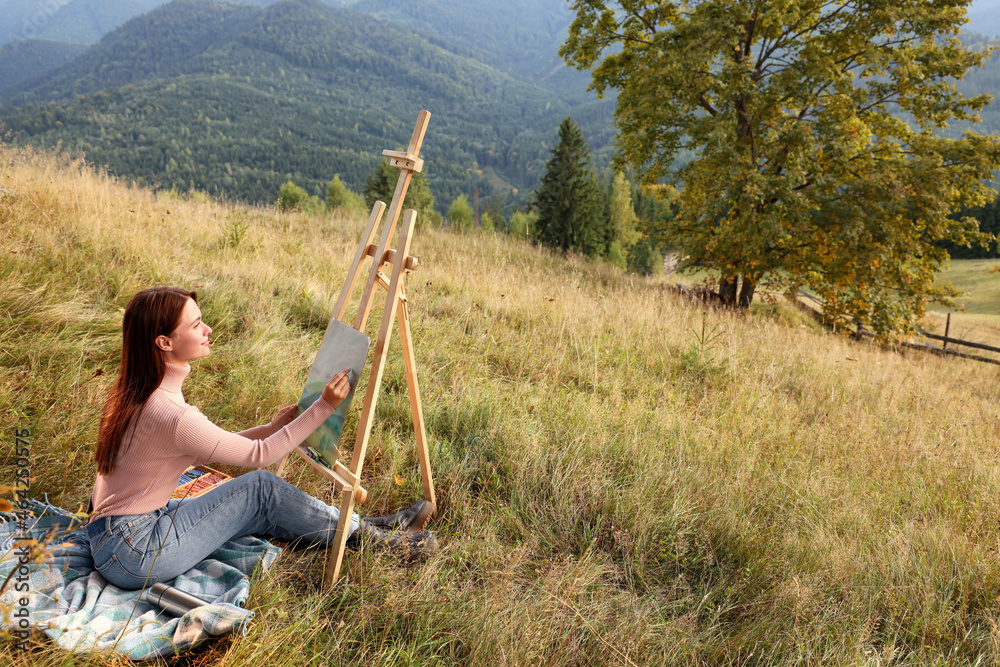 Young woman drawing landscape with soft pastels in nature. Space for text