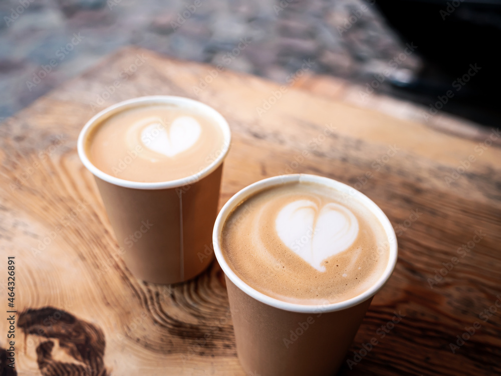 Cappuccino coffee in cardboard mug on wooden table at outdoor cafe
