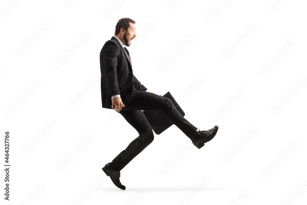 Full length profile shot of a businessman with a briefcase walking silly on tiptoes