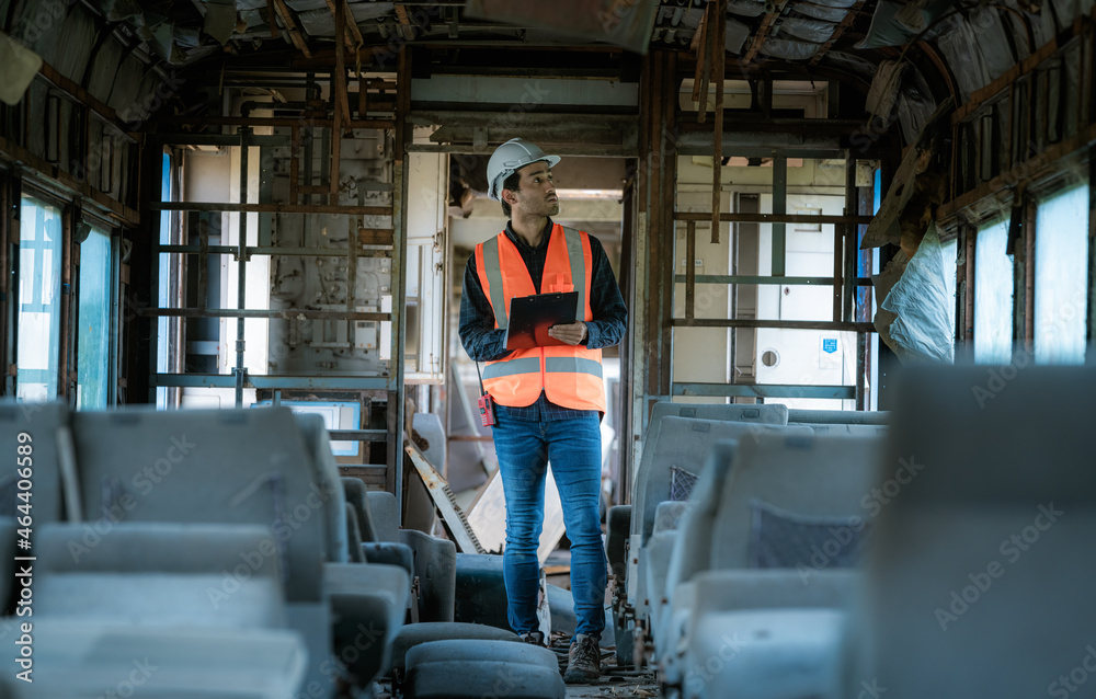 Engineer under discussion inspection and checking construction process railway switch and checking work on railroad station .Engineer wearing safety uniform and safety helmet in work.