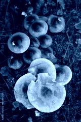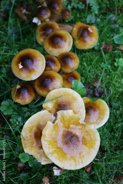 Clump of Honey Fungus covered by raindrops in the forest. Armillaria mellea on autumn season