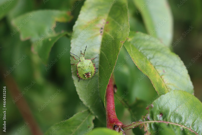Green shield bug on Rose leaves. Young Nezara viridula insect on Rose bush in the garden