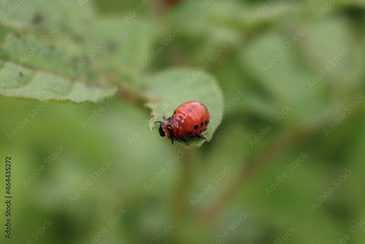 Close-up of red larva of the Colorado potato beetle eating potato leaves. Leptinotarsa decemlineata in the vegetable garden on summer