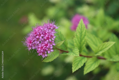 Close-up of little pink flowers of Spirea or Spiraea bush on summer. Spiraea japonica in bloom